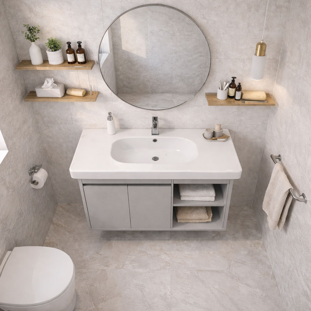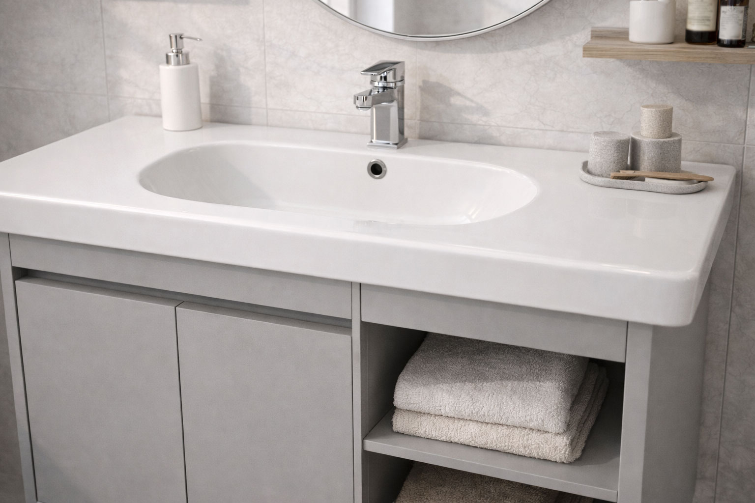 وحدة حمام عصرية بتصميم بسيط وأنيق، تضم ضلفتين واسعتين للتخزين وبوكسين جانبيين إيزي أكسس لترتيب الفوط والإكسسوارات بسرعة. توفر تنظيماً عملياً واستغلالاً مثالياً للمساحة مع تشطيب عالي الجودة يدوم طويلاً. متوفرة بعدة مقاسات وألوان حسب الطلب، وتناسب معظم الأحواض القياسية لتمنح حمامك مظهراً مرتباً هادئاً متناسقاً عصرياً عملياً يومياً أنيقاً مريحاً جداً للغاية دائماً ثابتاً وتناسب احواض موبيليا مثل ديورافيت وسلني بيور وبليزا وايديال واينوفا