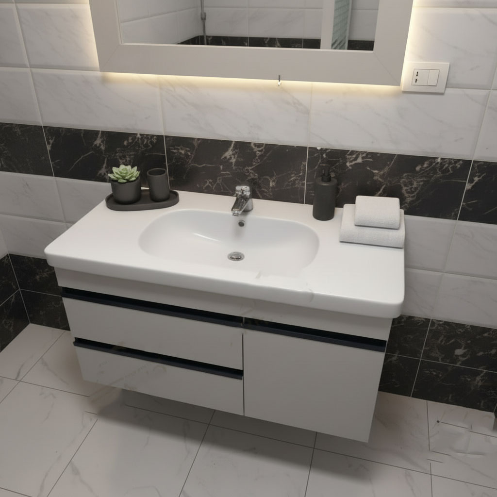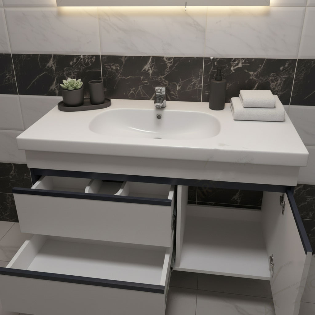 وحدة حمام عصرية بتصميم مميز تجمع بين درجين عمليين وضلفة واسعة لتنظيم مثالي للمستلزمات اليومية، مزودة بمقبض ميتال أنيق يضيف لمسة فخامة عصرية. تشطيب عالي الجودة وخامات متينة تدوم طويلاً. يمكن تصنيعها بعدة مقاسات وألوان حسب الطلب، وتناسب أحواض ديورافيت وإينوفا وإيديال وبليزا لتكمل حمامك بمظهر مرتب أنيق عصري عملي متناسق مريح يومي ثابت جذاب رائع جداً
