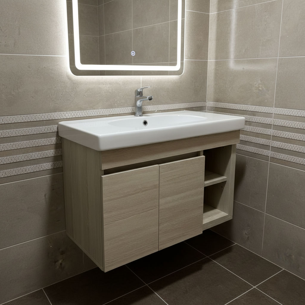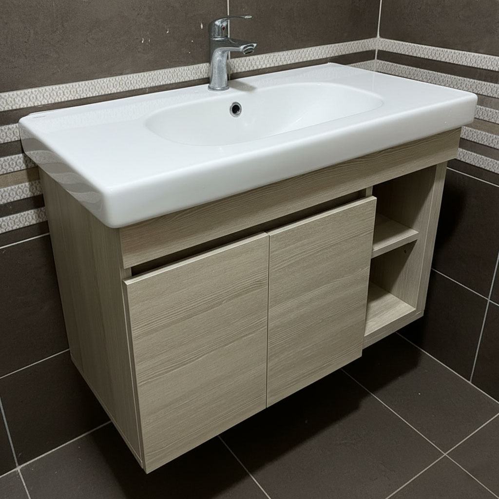 وحدة حمام عصرية بتصميم خشبي أنيق تجمع بين ضلفتين واسعتين ورفين جانبيين للتنظيم الذكي واستغلال المساحة بكفاءة عالية. تشطيب فاخر وخامات عالية الجودة تضمن متانة تدوم طويلاً. يمكن تصنيعها بعدة مقاسات وألوان حسب الطلب، وتناسب أحواض ديورافيت وإينوفا وإيديال وبليزا لتكمل حمامك بمظهر مرتب أنيق عصري عملي متناسق مريح يومي ثابت جذاب للغاية دائماً مميز