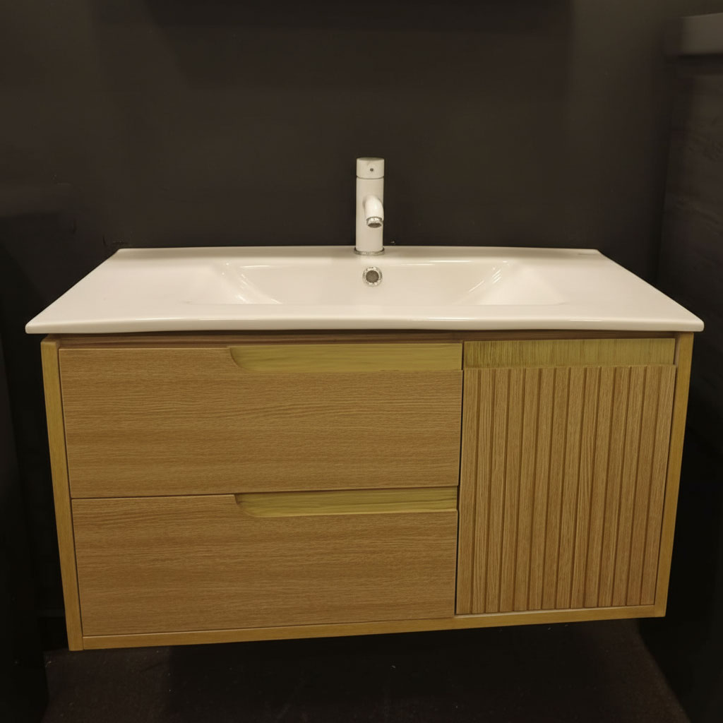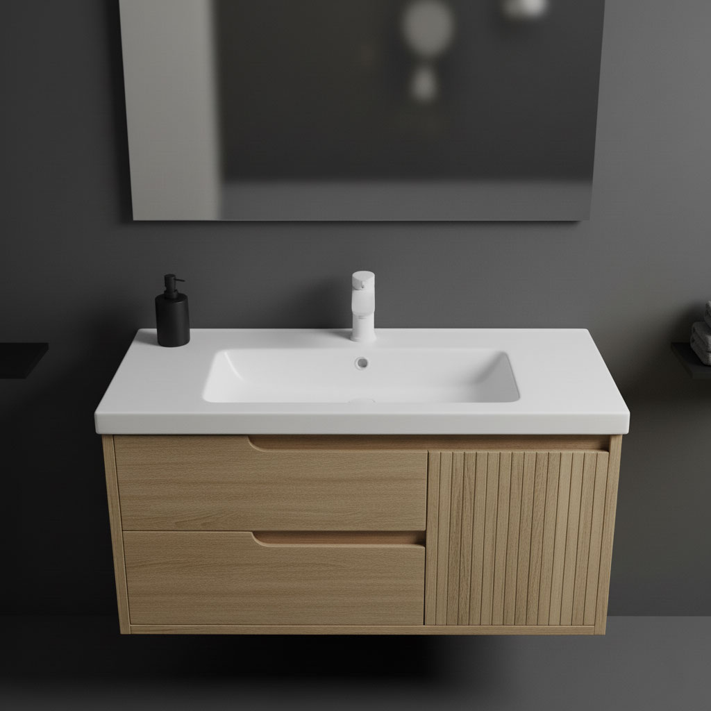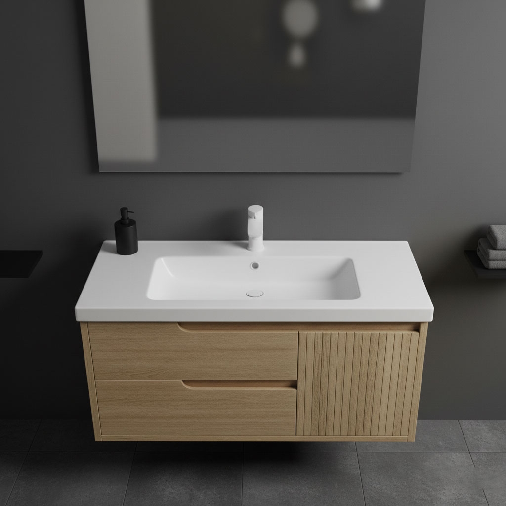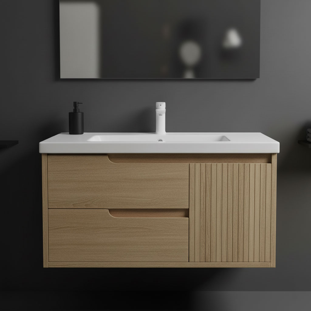 وحدة حمام عصرية بتصميم خشبي أنيق تجمع بين درجين عمليين للتخزين الذكي وضلفة جانبية راوتنج تضيف لمسة ديكور مميزة، مع مقبض بيلت إن راوتينج يبرز الخطوط النظيفة. تشطيب فاخر وخامات عالية الجودة تضمن متانة تدوم طويلاً. متوفرة بعدة مقاسات وألوان حسب الطلب، وتناسب معظم الأحواض القياسية لتمنح حمامك مظهراً مرتباً أنيقاً عصرياً عملياً متناسقاً مريحاً يومياً